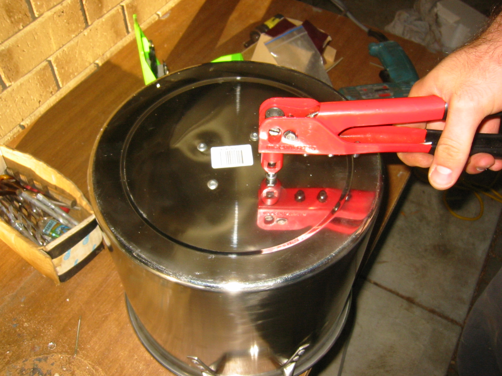The first design worked so well, and was so cheap, that we really could not see replacing it with anything fancier unless we started to cast more frequently. The bucket that formed the outside of the first foundry was scavenged to act as the inner hull for this, larger, second foundry. The inner hull is pop riveted to the outer hull. The outer hull is a stockpot with a hole drilled in its side in order to allow for the forced air pipe. This design also cost under $20 and we ever upgrade this design to use refractory we should even be able to scavenge the stockpot.