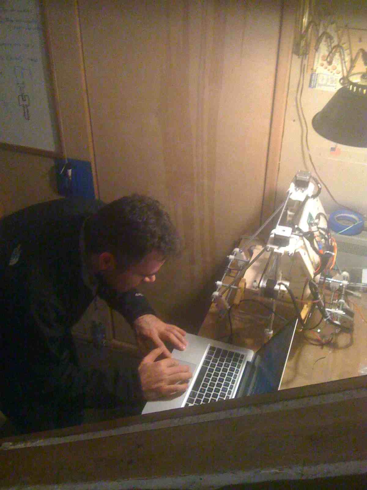 I used the Generation 6 electronics, and added a MK1 Heatbed Heated Bed. For the extruder I bought a Wade extruder kit from dude_146 on ebay. It works well, and I would buy from him again, but the print quality was a bit low - he needs to keep tuning his printer. I used a J Head MKIII-B Hot-End with the extruder. So fortunately I share my weird interests with my friends. The last time Ross visited the US he flew up for a few day visit and we dueled each other building Stirling engines. This time he arrived just in time to help me build the printer. We got the whole thing up and running in about 3 days. The pictures to the left show the completed printer, and Ross driving the printer shown for scale. |